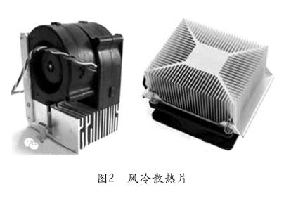 风冷散热片是最常见的散热器件,一般是导热性能比较好的铝或铜等材料,加工成散热翅片以增加散热面积和效率,通过特殊的介质(通常是导热硅脂)紧贴住发热量很大的芯片,然后再在散热片上固定一个风扇来增加流速,提升换热能力,更快带走热量,从而达到对芯片散热的目的。提升风冷散热的途径是提高散热面积、提高换热系数、提升辐射散热效率、使用散热效率更佳的材料、粘合充分接触保证降低传导热阻等,风冷散热片如图2所示。
