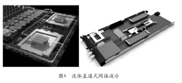 采用间接冷却的液冷散热系统,对IT设备没有明显改动,仅需将原风冷散热片替换为液冷散热片,成为冷媒换热系统。常规情况下,芯片工作温度为20~60℃区间,可以使用无相变的水(离子水+铜缓蚀剂)或者水氟转换系统进行换热,通过外部冷却水或冷冻水系统实现系统换热。该系统重点在于选择合适的冷媒,并且设计复杂的冷媒管路到达每个机架,为每个IT设备设计无滴漏的快速接头,保证液冷系统支持热插拔,实现维护时不中断整个系统,并避免换热介质流出。流体直通式间接冷却如图4所示。数据中心中较多的循环管路,成了故障维护和水力平衡的难题。