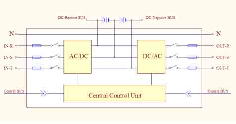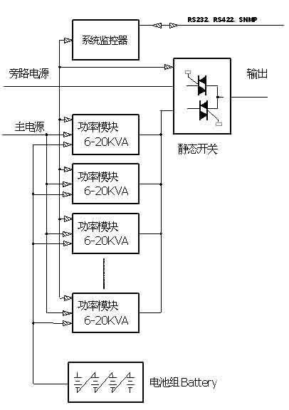 系统为模块式结构,由静态开关模块、系统监控模块和1到24个功率模块并联组成。