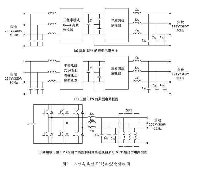 2009年,在《UPS应用》的组织发动下,进行了一场工频与高频UPS的大辩论,结果是高频UPS获胜。工频UPS失败的原因是:SCR多相相控整流是一个时滞环节,无法实现输出电压的快速调节,并会导致市电电网电压畸变,对市电*大,输入功率因数低、效率低、体积重量大,直流电压调节为非线性,对市电电压波动适应能力差,不能数控等而被淘汰。此后,由于采用平衡电感24相自耦变压工频整流器和采用自耦变压器的多相工频整流与 U d -PWM控制的研制成功,使工频UPS的性能完全赶上了高频UPS,但是高频UPS的开关损耗要大8~33倍[视高频UPS的开关频率(10~20)kHz,与工频UPS整流器的相数(12~24相)而定],这又促使高频UPS开关研制出了SPWM节能控制与软开关技术的应用,而SPWM节能控制又促使高频UPS的输出逆变器采用了中性点形成变压器NFT的应用,把高频UPS的开关损耗减小了50%以上。至此工频与高频UPS的性能已经基本相同,并达到了相当高的水平(市电输入功率因数PF都达到了0.999,对市电电压波动的适应能力都达到了±30%,整机效率都达到了94%,体积重量两者基本相同)。工频与高频UPS的典型电路框图如图1所示,其中图(a)为高频UPS的典型电路框图,图(b)为工频UPS的典型电路框图,图(c)为高频或工频UPS采用节能控制时逆变器采用中性点形成变压器NFT输出的电路框图。