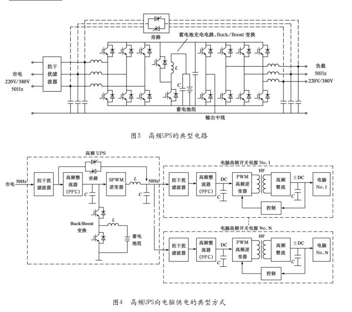 ①当前电脑用的高频开关电源电路,已经具备了除不能实现当市电中断时可以独立地继续向电脑进行直流供电的功能之外(因为在高频开关电源中,没有接入储能蓄电池组),已具备了UPS的所有功能。例如用图2所示的由抗*滤波器、高频整流器(PFC)、PWM高频逆变器、高频变压器和高频整流器组成的高频开关电源的电路框图,与图3所示的高频UPS电路进行比较可以发现,它们的电路组成、电能变换流程和变换方式是完全相同的,因此它们所具有的相应功能也是相同的。即电脑中的高频开关电源也具备了UPS的功能。只要在高频整流器(PFC)与PWM高频逆变器之间接入一组储能蓄电池,就可以构成一个性能优良的高频UPS。