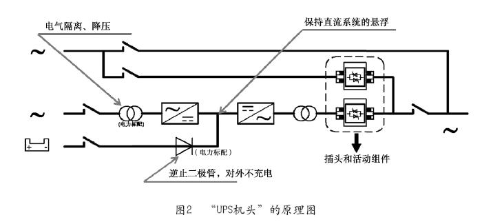 背景情况:上世纪90年代,随着DCS的引进,电力行业开始批量使用UPS,发现UPS里的电池故障率高,国内外的变电站、电厂等有直流屏的用户,对UPS电池的管理提出了一个设想,希望用“UPS机头”,即UPS不配电池和充电,直流端直接接到直流屏上。这样用户的直流维护人员保证了电池的安全,提高了UPS的可靠性,也降低了电池的投入。“UPS机头”的原理图如图2所示。