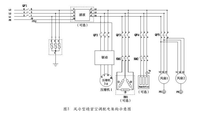 直膨式丝瓜视频污染APP的供电采用三相电源制式,电源范围一般为380~415Vac/50Hz,380~415Vac/60Hz,和440~480Vac /60Hz。在空调系统启机时,一般是先启动室内机(风机,控制系统等),然后启动室外冷凝器,再启动制冷压缩机。图3为风冷型丝瓜视频污染APP的配电示意图,从 配电架构并结合启机时序,在考虑UPS供电时,需参考室内丝瓜视频污染APP的风机、控制系统、室外冷凝器和制冷压缩机的供电需求,选择合适的UPS,达到配电的高 性价比。
