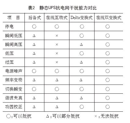 表2为上述四种静态UPS架构抗电网*能力的对比。可以看出,在线双变换式UPS是抗电网*能力最强的。