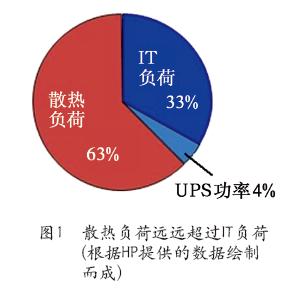 高密度数据中心发展至今,迫切需要解决的问题是降低PUE值。随着电子信息机房IT设备和供配电系统的高度集成化,机房散热量日渐趋高,必须要有强大的制冷系统,来维持机房的环境温度能保持在一个合理范围内。从图1中可以看出,电力在数据中心的消耗仅有33%供给了IT负荷,散热负荷却高达63%,也就是说,散热负荷已经远远超过了IT设备的负荷。这意味着,降低IT设备的发热量,可相应地降低散热负荷,也就是降低了用于制冷设备的电力,这对于降低PUE值是一个关键的因素。