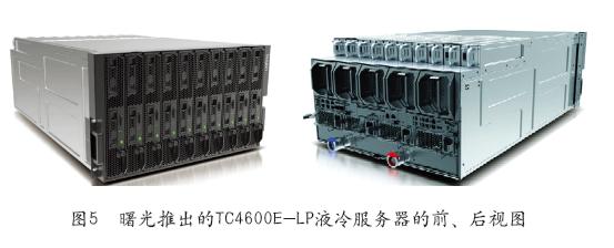 曙光推出的TC4600E-LP液冷服务器是以原有风冷型刀片为原型,进行了液冷改造设计,除去CPU和显卡的风冷式散热器,改造为液冷冷板。图5为TC4600E-LP液冷服务器的前、后视图。