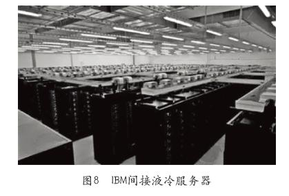 IBM的新SuperMUC超级计算机中心(LRZ)Super MUC与IBM xiData Plex均采用了水冷技术,即采用40℃的温水作为IT设备制冷的冷媒工质。比起普通的风冷系统,这种水冷系统的散热效率高4000倍,能耗也大幅度降低。除此之外,其产生的热水可以给莱布尼兹超级计算机中心园区的其他生活建筑供热,每年可节约125万美元。IBM间接液冷服务器如图8所示。