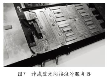 神威蓝光公司的间接液冷服务器中的冷却用水是内部封闭循环,是来自矿泉水厂处理过的纯水。中间是铝制液冷散热板。神威蓝光公司的间接液冷服务器的优势是集成度高,水冷散热高效,可在一个机柜内存放更多的CPU,仅依靠9个运算机柜就达到了很高的运算能力。神威蓝光间接液冷服务器如图7所示。