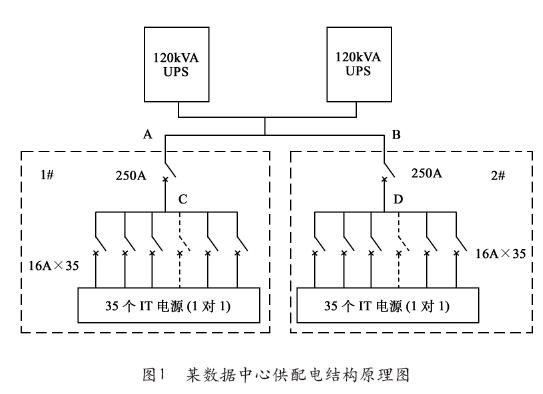供配电结构原理图。图中,两台120kVAUPS并联后送到两个配电柜,每个配电柜各有35个16A的微型断路器。一天夜里1#配电柜突然有八个输出断路器跳闸。后来检查结果是一个IT电源输入短路,两个IT电源输入保险丝烧断。这就提出了如下的问题: