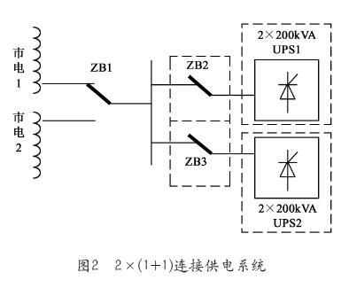 又如,某机关数据中心购置了4台200kVAUPS做2(1+1)连接,如图2所示。机器安装后在考机期间,为了检测在市电转换时的输出不间断功能,就在转换开关ZB1由市电1向市电2切换瞬间,分路断路器ZB2和ZB3跳闸,两路并联UPS1和UPS2各坏了1台,检查发现都是可控硅整流器烧毁和控制电路板受损。按道理说由市电1切到市电2是一