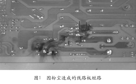 当UPS采用风冷散热时,会将空气中的粉尘吸入UPS内部。粉尘粘附在风扇或电路板上,影响UPS散热,并有造成电路板短路的风险。图1为京沪高铁箱变UPS电路板因粉尘导致的短路故障的照片。