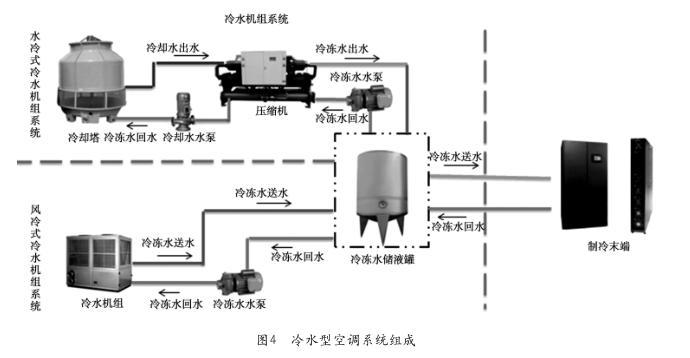 冷水机组作为蒸汽压缩制冷方式的设备,按其冷凝器散热方式的不同,可分为水冷式冷水机组和风冷式冷水机组。水冷式冷水机组采用冷却水为冷凝器进行散热,一般配合冷却塔使用;风冷式冷水机组利用环境空气为冷凝器散热,两者的基本构成如图4所示。