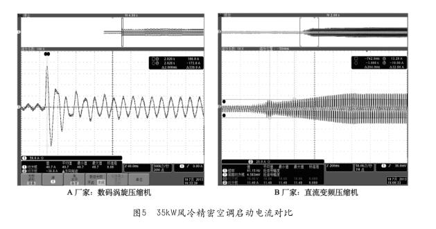 从表4的对比分析可以看出,数码涡旋式压缩机和变频压缩机的冲击电流有较大区别,采用UPS为直膨式风冷丝瓜视频污染APP配电时,需考虑压缩机冲击电流的影响。以制冷量35kW的风冷行级丝瓜视频污染APP为例,A厂家采用数码涡旋压缩机,B厂家采用直流变频压缩机,其整机启动电流的对比如图5所示。