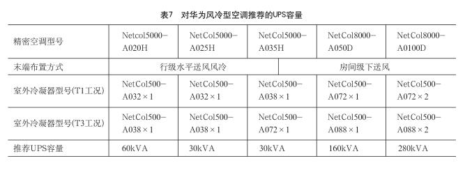 考虑对华为公司提供的风冷型丝瓜视频污染APP全部采用UPS进行配电,根据推荐的配置部件,按照上述配置原则,推荐的UPS容量见表7。