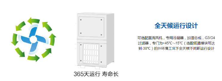 可选配支流风机,专用冷凝器,加湿总成,G3/G4过滤器,专门为+45℃~-15℃(选配低温模块可达到-30℃)的外环境工况下全天候不间断运行设计。