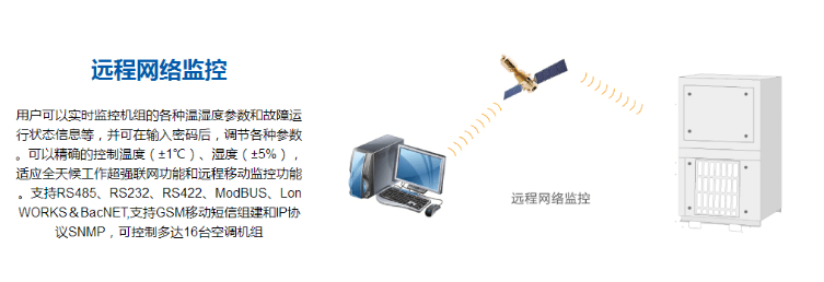 用户可以实时监控机组的各种温湿度参数和故障运行状态信息等,并可在输入密码后调节各种参数。可以精确的控制温度(±1℃)、湿度(±5%),适合全天候工作。强大联网功能和远程移动监控功能。支持RS485、RS232、RS422、ModBUS、LonWORKS&BacNET,支持GSM移动短信组建和IP协议SNMP,可控制多达16台空调机组。